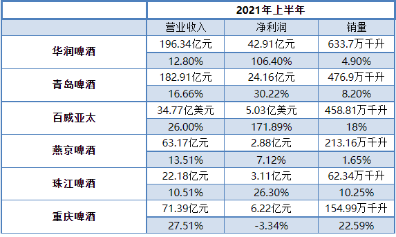 2021年上半年啤酒集團(tuán)啤酒銷量及營(yíng)收利潤(rùn)明細(xì)表