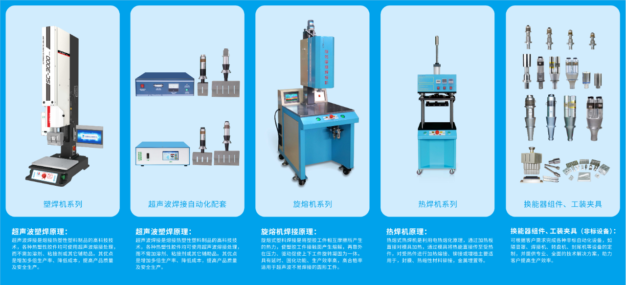 超聲波塑料焊接設備、旋轉摩擦焊接設備、熱板焊接設備、超聲波焊接自動化配套、周邊設備配套系列等。