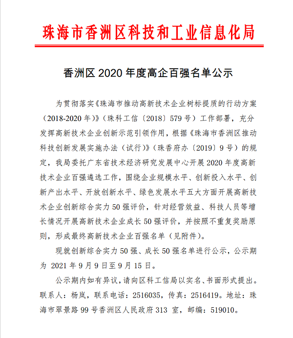 珠海市香洲區科技和工業信息化局發文公布《香洲區2020年度高企百強名單公示》。珠海靈科自動化科技有限公司(以下簡稱靈科超聲波)榮獲“香洲區2020年度高新技術企業成長50強”。