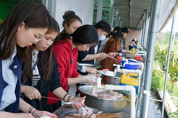 食材到達(dá)后齊刷刷上手,清洗食材,準(zhǔn)備餐具,串肉上簽,扒蒜切菜再剁肉......靈科家人們?cè)跓炯芮案黠@神通。點(diǎn)火的,刷油的,調(diào)制調(diào)料的......燒烤現(xiàn)場(chǎng)繁忙而又井然有序。